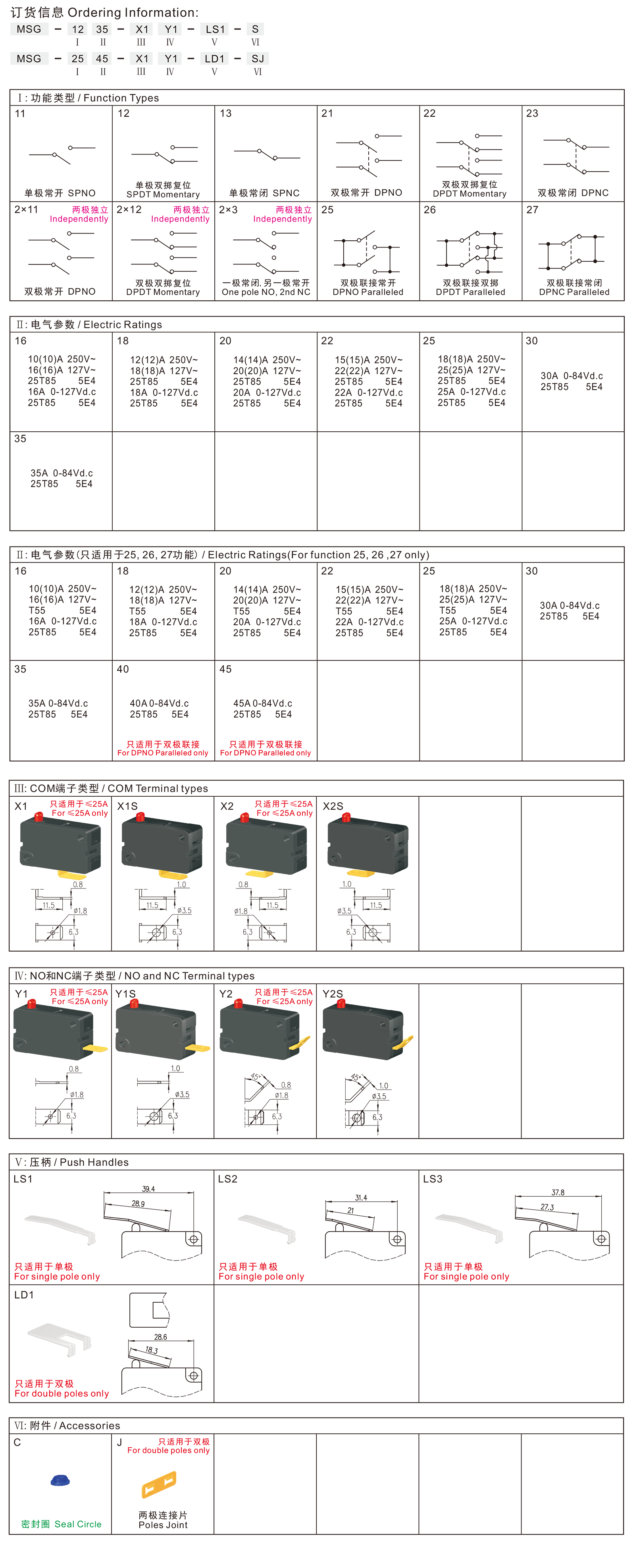 ◆MSG series are one big dimension micro switches, contact gap ≥3.0mm, optional with Seal Ring for dustproof, the voltage up to 127Vd.c, specially for used in high rated DC power-tools and DC gardening tools, such as 18V up DC Angle Grinders, 18V up DC Grass Trimmers, 18V up DC Electric Chain Saws, 18V up DC Blowers, 18V up DC Hedge Trimmers, 18V up DC Multi-head Tools, etc.