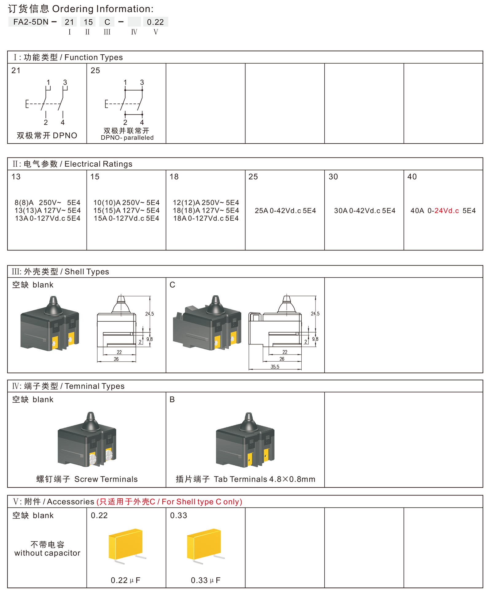 FA2-5DN series are special type Push-button switch, integrated dustproofwith snap-action structure, for used in portable power-tools such as 125mm and 150mm Angle Grinders, Polishers Grinders, etc.