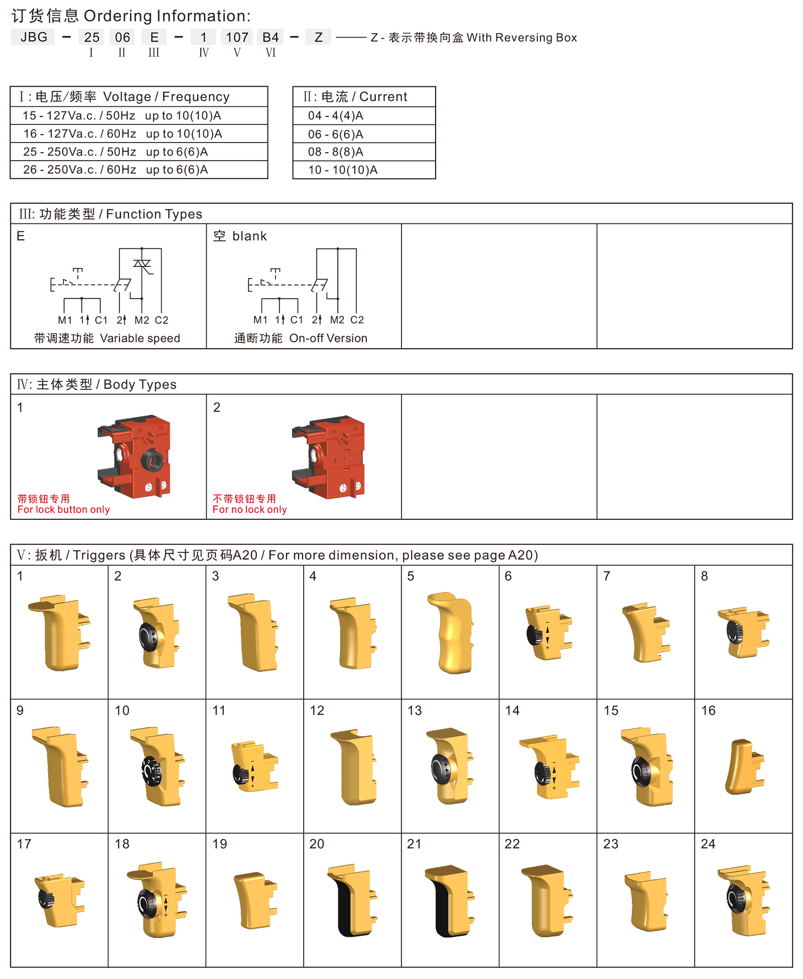 JBG?series are one mini-type variable speed trigger switches,?integrated dustproof,?with compact size, the handle of tools can be designed to more fine. For popular used in portable power-tools such as: Drills, Impact Drills, Rotary Hammers, Jig Saws, Reciprocating Saws, Sabre Saws, Electric Mixers, Polishers, Orbit Sanders, etc.
