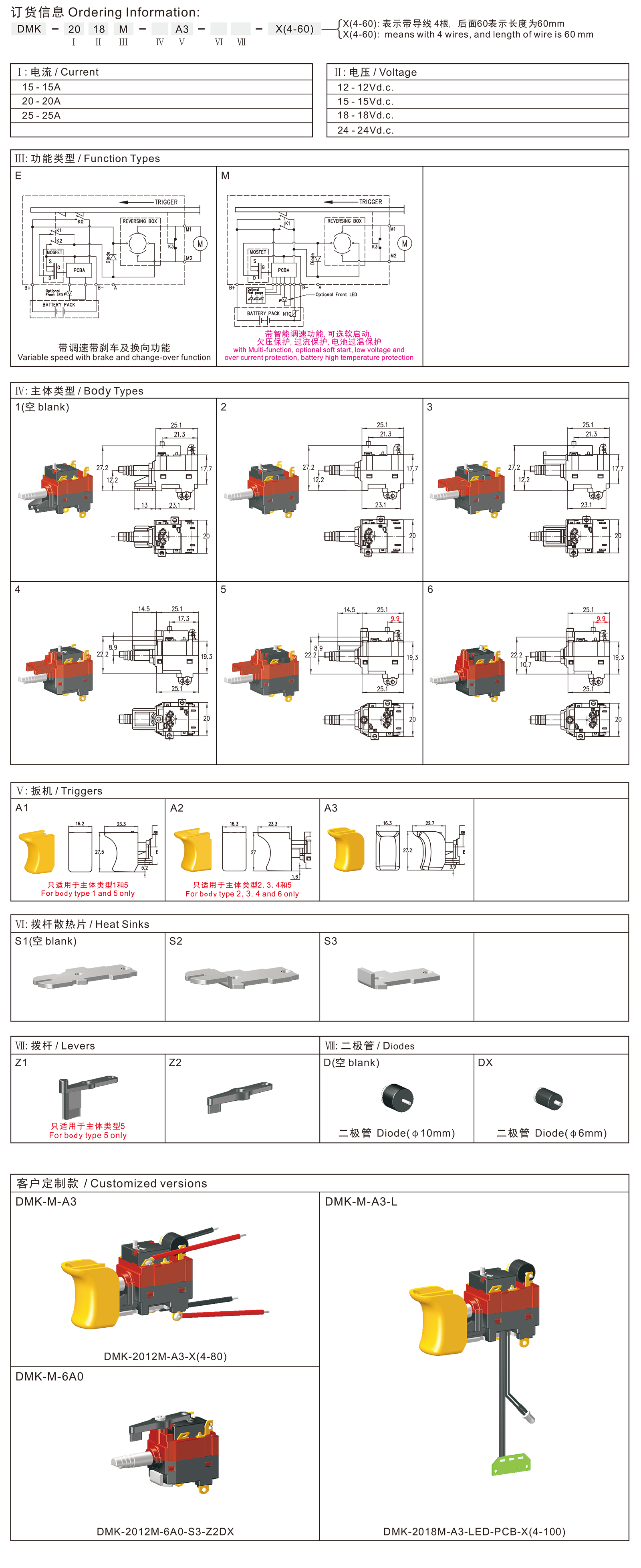 DMK?series are one special type DC variable speed trigger switches,?integrated dustproof?and?mechanical brake contact, optional with inner reversing structure, commonly for used in DC cordless portable power-tools such as: Cordless Drills, Cordless Screw Drivers, etc.