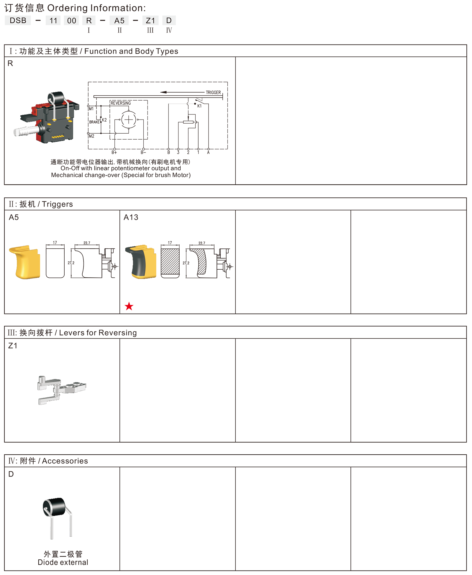 ◆DSB系列是一款專用型的直流信號扳機開關(guān),集成防塵功能和機械剎車接點,適用于各類直流充電式電動工具,如:充電式電鉆、充電式電錘、充電式螺絲起子、充電式?jīng)_擊扳手等。特殊設(shè)計的外形可以和線路板直接連接,而不需要外接導(dǎo)線。