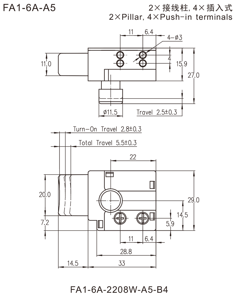 →2×接線柱端子 Pillar terminals φ=2.6mm or 2.8mm