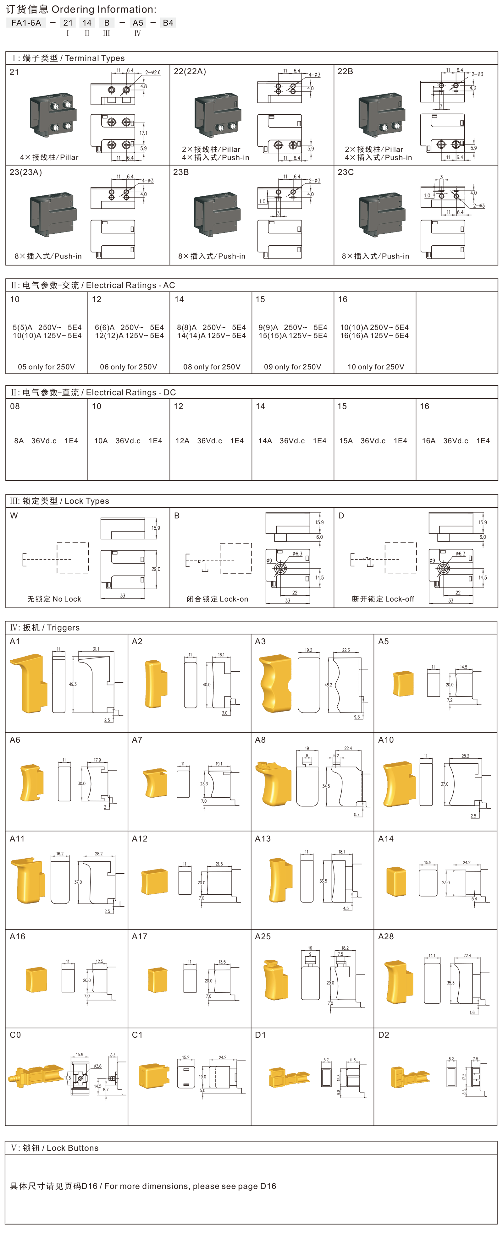 FA1-6A series are general type trigger switch, for used in portable power-tools and gardening tools such as Electric Mixers, Electric Nailers, Grass Trimmers, Circular Saws, Electric Chain Saws, Electric Lawnmowers, Electric Snowthrowers, etc.