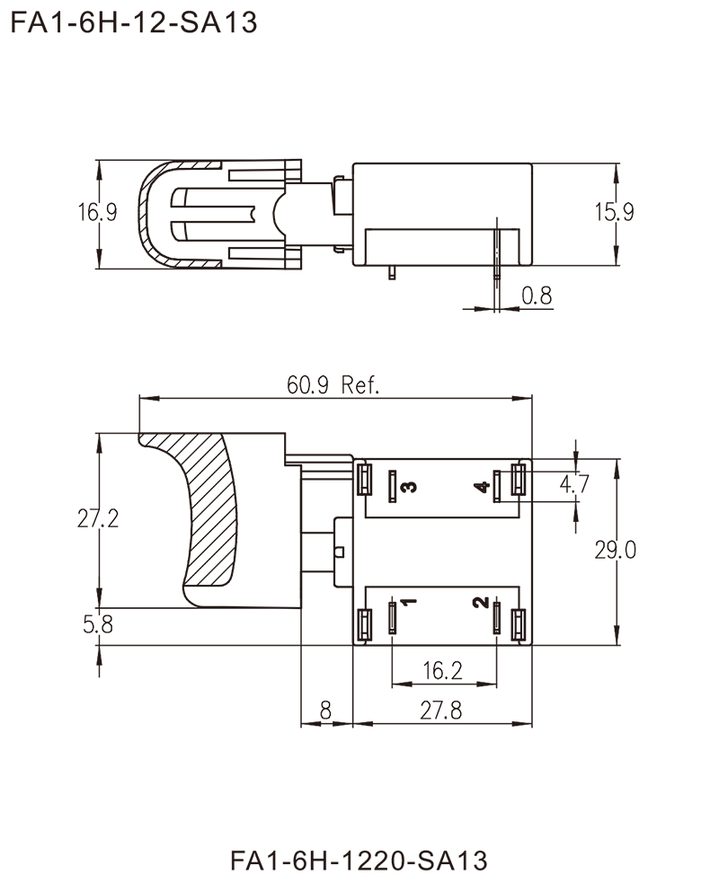◆FA1-6H series are general type high rated trigger switch, have integrated dustproof version, special for used in DC power-tools and gardening tools such as DC Circular Saws, DC Electric Chain Saws, DC Electric Lawnmowers, DC Electric Snowthrowers, etc.