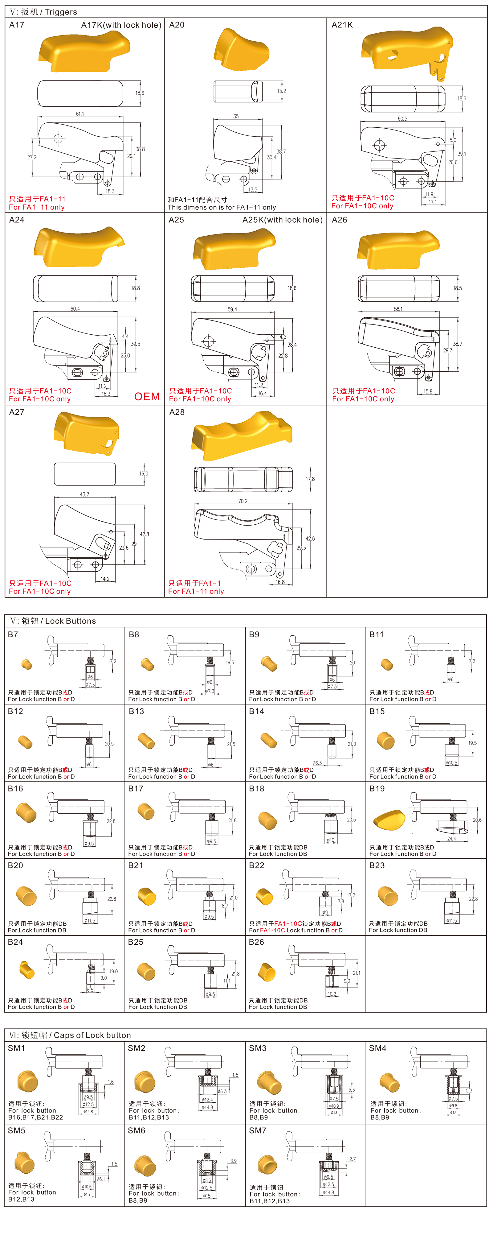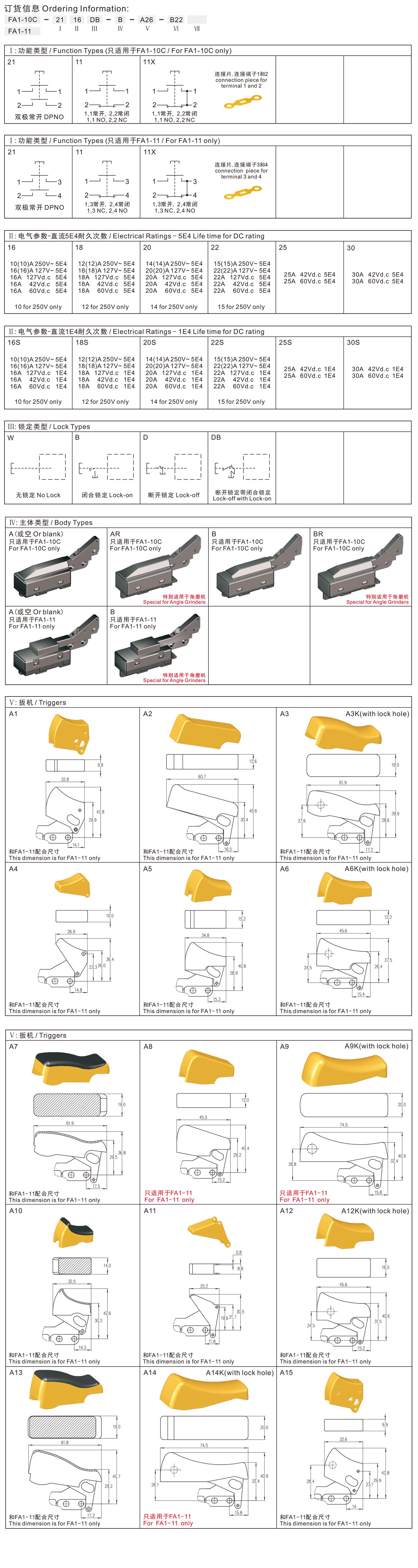 ◆FA1-10C, FA1-11 series are general type high rated trigger switches, integrated dustproof, with snap-action structure, for used in high rated bench-top, portable power-tools and gardening tools such as Cut-off Machines, Miter Saws, 150mm, 180mm and 230mm Large Angle Grinders, Polishers, Circular Saws, Rotary Hammers, Demolition Hammers, Electric Chain Saws, etc.