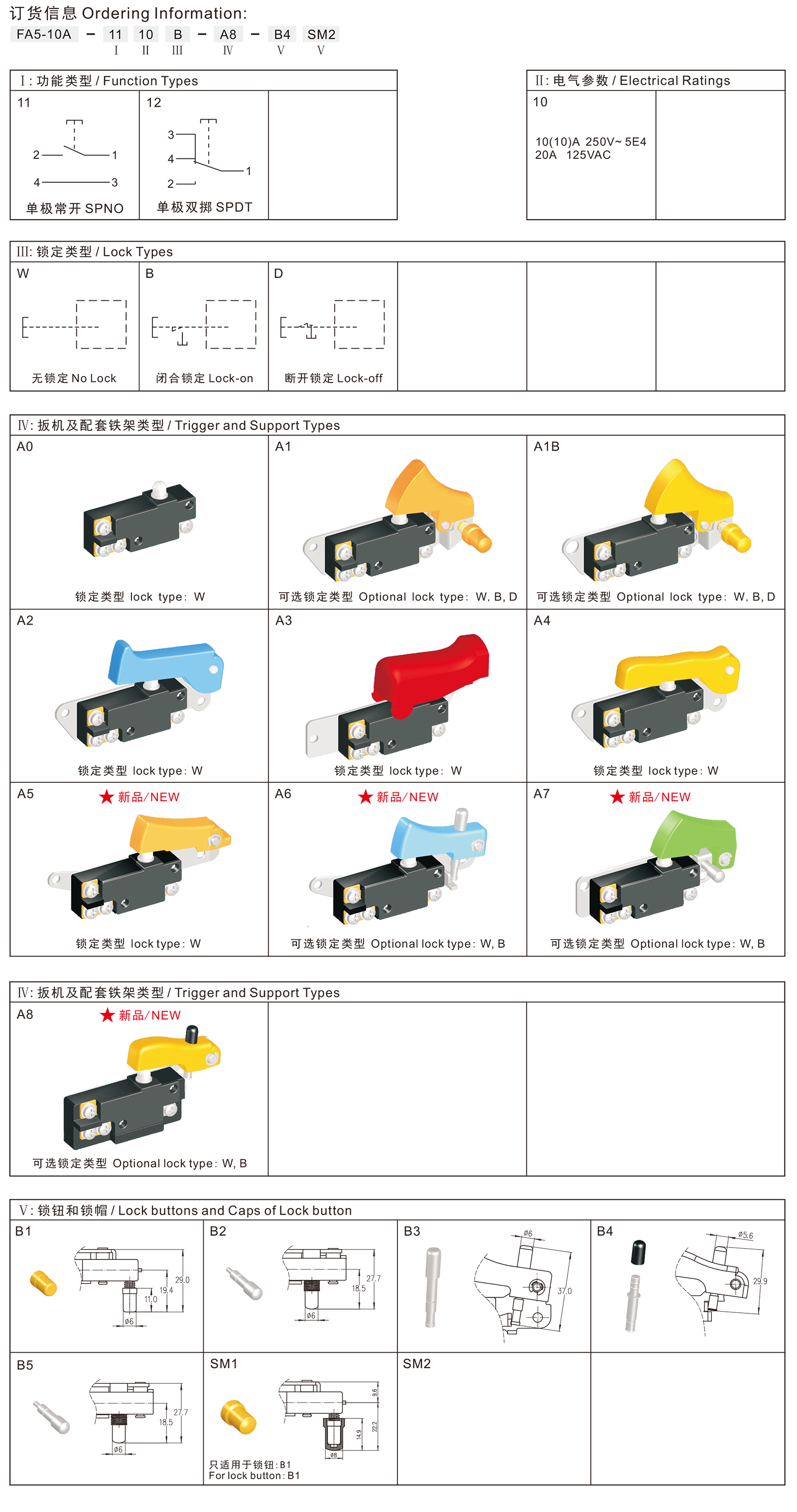 ◆FA5-10A, FA5-10B series are one general type trigger switch, integrated dustproof, with snap-action structure, for used in portable or bench top power-tools such as Cut-off Machines, Miter Saws, 125mm and 150mm Angle Grinders, Rotary Hammers, Demolition Hammers, etc.