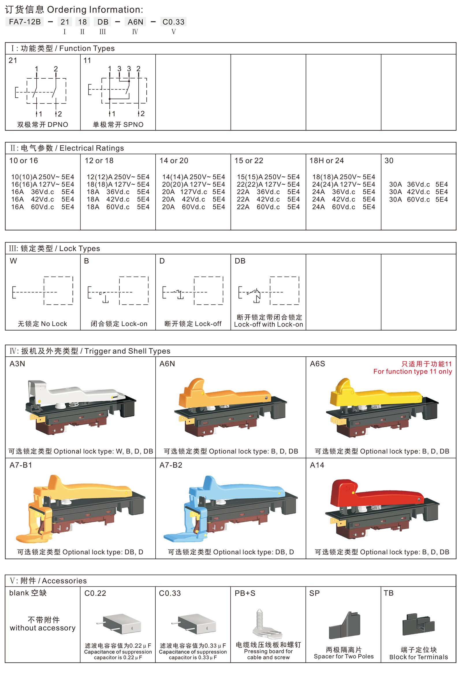 ◆FA7-12B series are special type high rated trigger switches, integrated dustproof, with snap-action structure, for used in high rated bench top or portable power-tools such as Cut-off Machines, Miter Saws, 180mm and 230mm Large Angle Grinders, Heavy Rotary Hammers, Heavy Demolition Hammers, etc. The body and trigger accept customize according to customer's request.