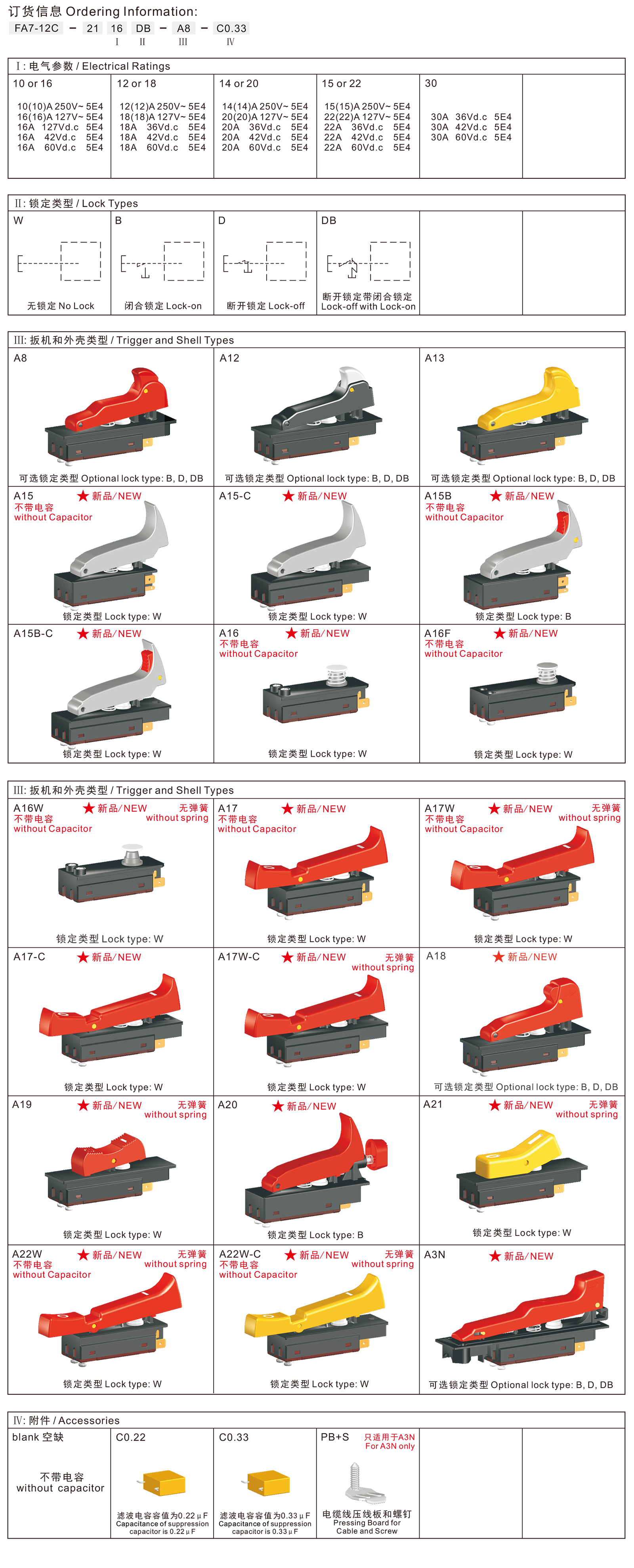 FA7-12C series are special type high rated trigger switches,integrated dustproof, with snap-action structure, for use in high rated bench top or portable power-tools such as Cut-off Machines,Miter Saws, 125mm and 150mm Angle Grinders, Rotary Hammers, Demolition Hammers, etc. These switch has more than 10 body and trigger types for customer's choice, also accept customize according to customer's request.