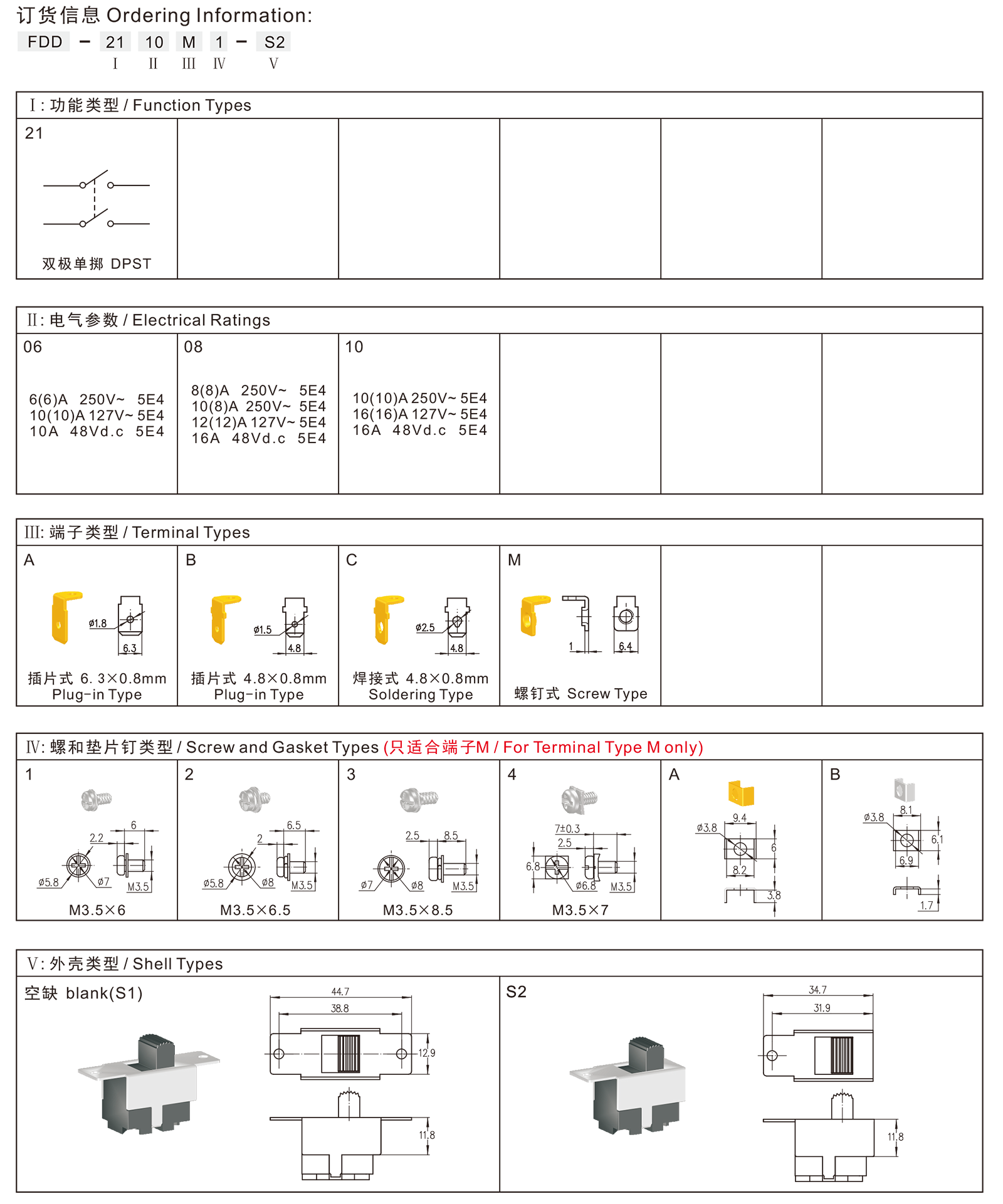 ◆FDD系列是一款專用型的滑動開關,也叫推拉開關或推撥開關,應用于各類電動工具和園林工具,如:電木銑、吹吸機等。 ◆FDD series are special type slide switches, for used in power-tools or gardening tools such as Routers, Blowers, etc.