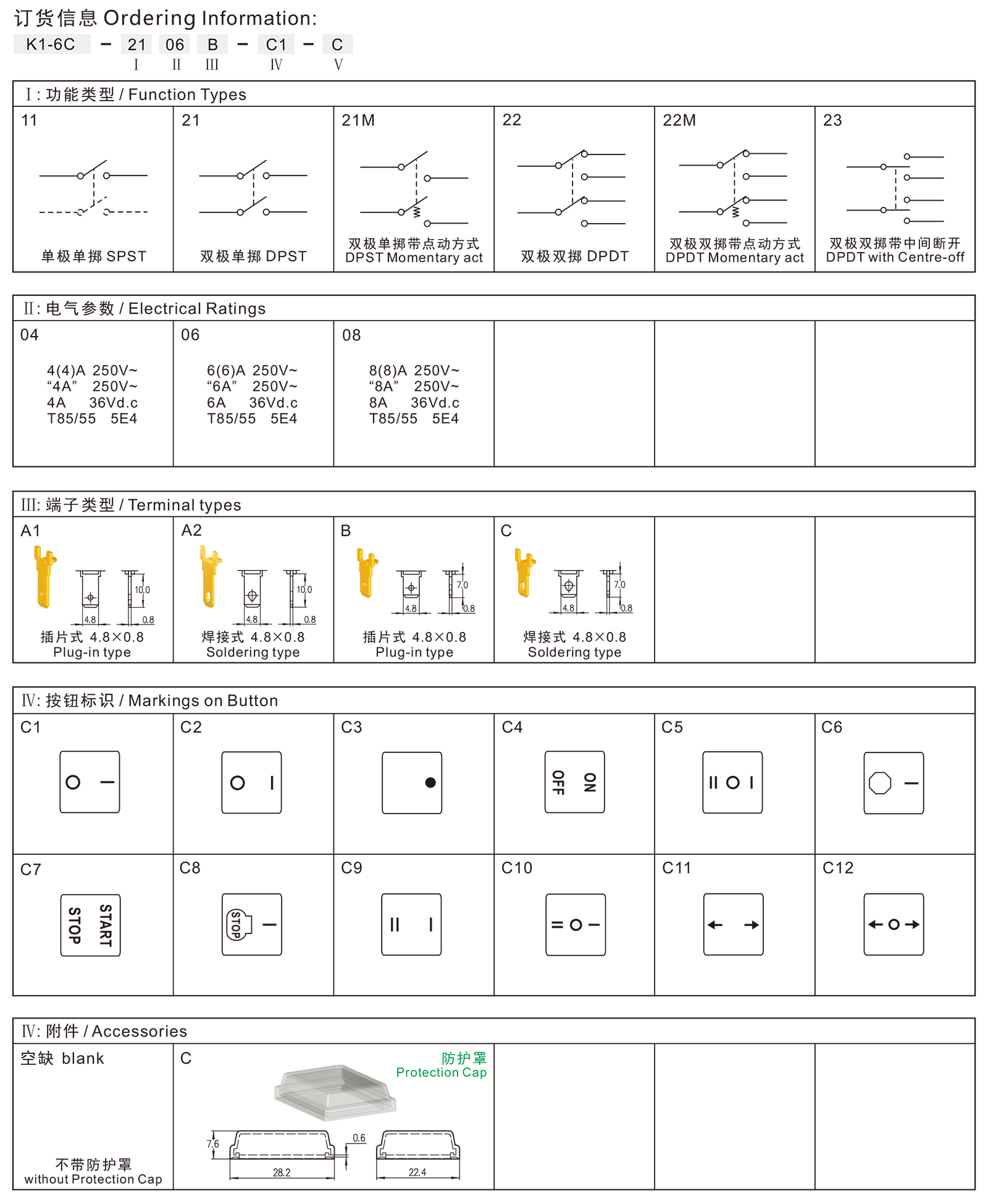 ◆K1-6C?series are one standard type rocker switch, optional with?Protection Cap?for?dustproof?and?waterproof, commonly for use in small Home appliances and office equipments, such as Reading Lamps Electric Fans, Printers, Game Players, Computer P ower-supplys, Power Sound Box, etc.