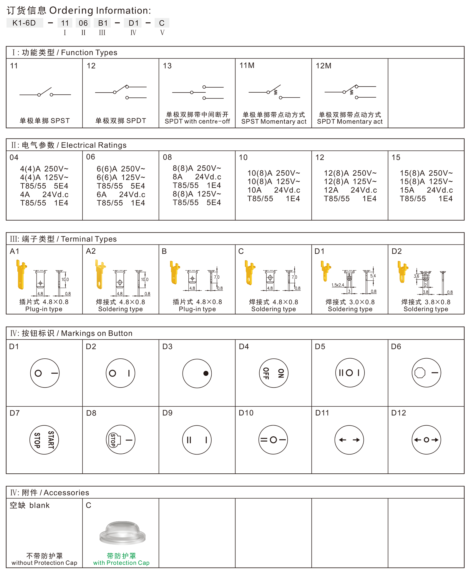 K1-6D series are one standard type rocker switch, optional with Protection Cap for dustproof and waterproof, commonly for used in small Home appliances, such as Portable Vacuum Cleaners,Reading Lamps, Electric Fans, Printers, Computer Power-supplys, Power Sound Box, etc.