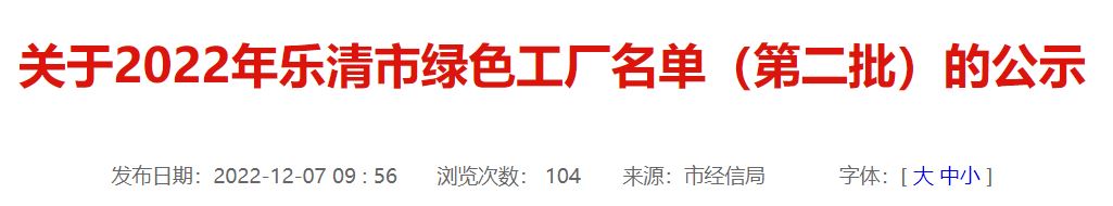 為加快全市工業領域碳達峰碳中和進程,促進工業高質量綠色發展,根據《關于開展2022年樂清市綠色工廠創建的通知》,樂清市經信局組織開展了2022年樂清市綠色工廠項目創建工作,現對驗收合格企業名單公示如下(詳見附件)。如有異議,請在公示期間內與我們聯系,并提交相關證明材料。