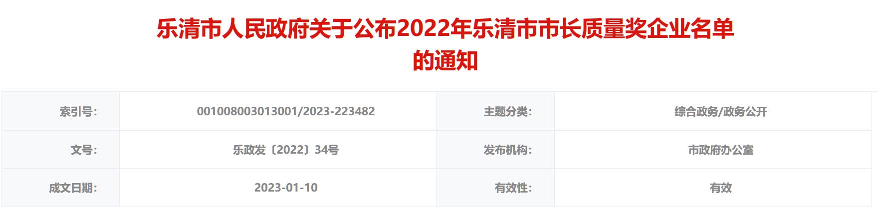 為引導和激勵全市企業加強質量管理,提高經營績效,促進高質量發展,根據《樂清市市長質量獎評審管理辦法》相關規定,通過企業自愿申報、市級部門資格審查、專家組資料評審及現場評審、評審委員會審議、社會公示等環節,經市政府研究決定,俊郎電氣有限公司、浙江金橋銅業科技有限公司、浙江科博電器有限公司、浙江佳奔電子有限公司等4家企業為2022年樂清市市長質量獎企業。