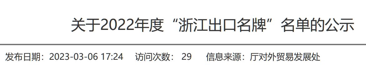 為加強出口名牌培育,提升出口產品國際競爭力,推動我省外貿高質量發展,根據《浙江省商務廳關于開展2022年度“浙江出口名牌”培育工作的通知》要求,我廳從去年8月啟動了“浙江出口名牌”申報評審工作,對2019年度“浙江出口名牌”進行到期復核,并新培育一批符合條件的企業。經過地市推薦、專題審核、省級部門意見征求等審核程序,擬認定2022年度“浙江出口名牌”241個(新增95個、復核146個),現將名單予以公示(見附件)。公示期為5個工作日(2023年3月6日-2023年3月10日)。